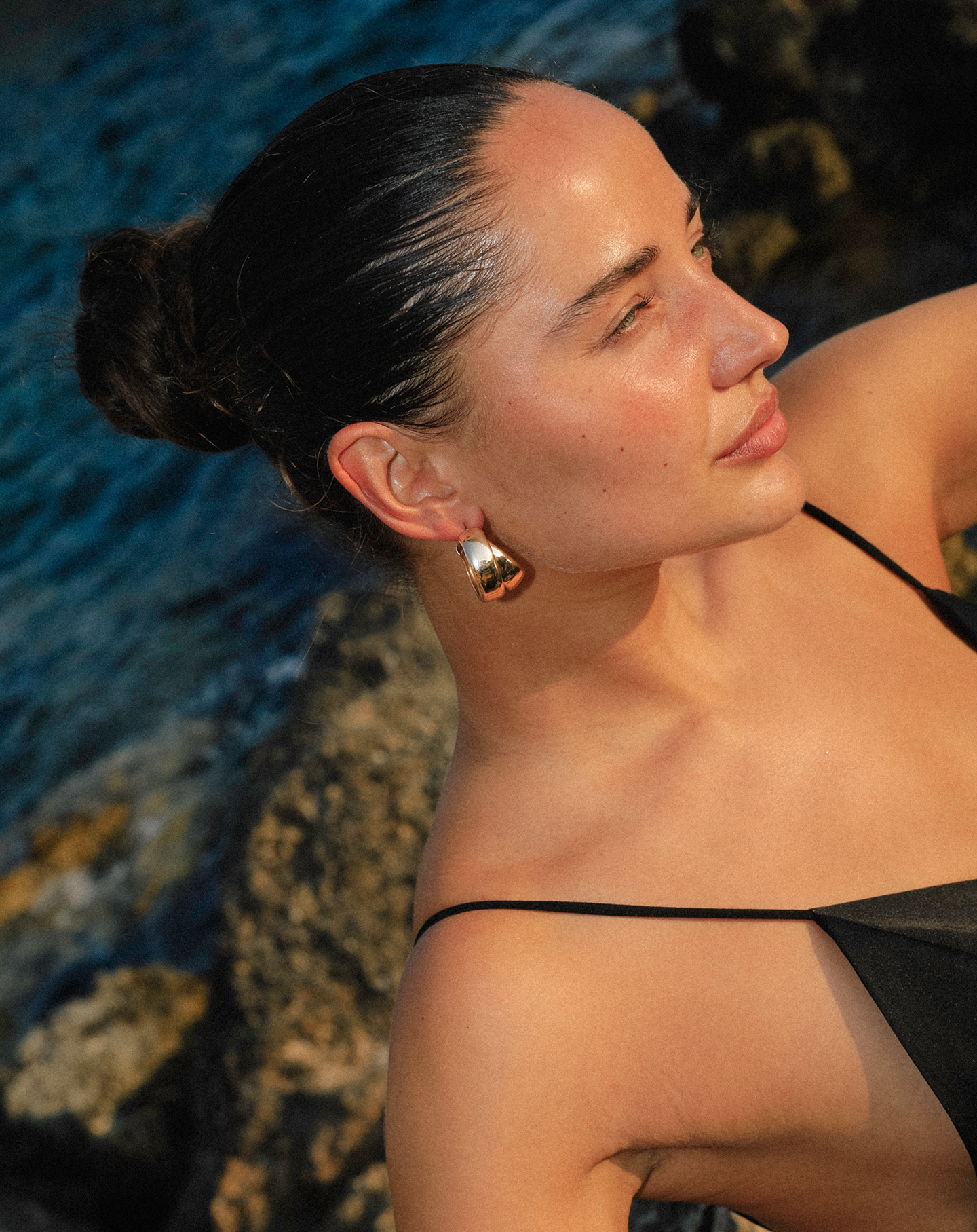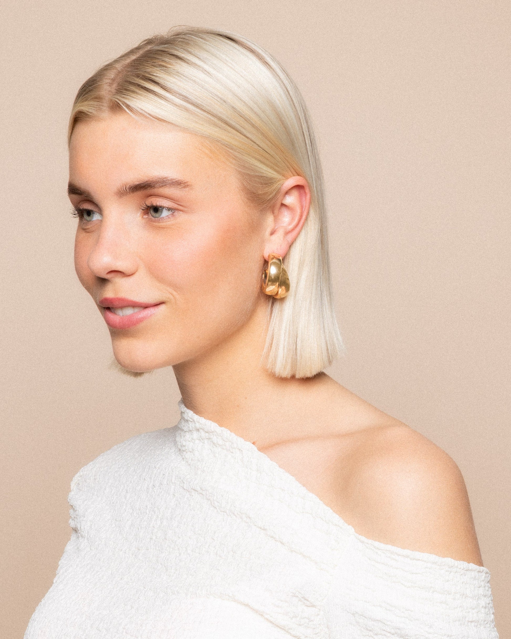 Los pendientes son dorados y tienen forma de doble aro. Combínalos con tu outfit favorito y estarás lista.